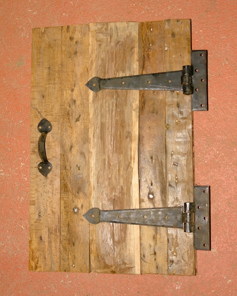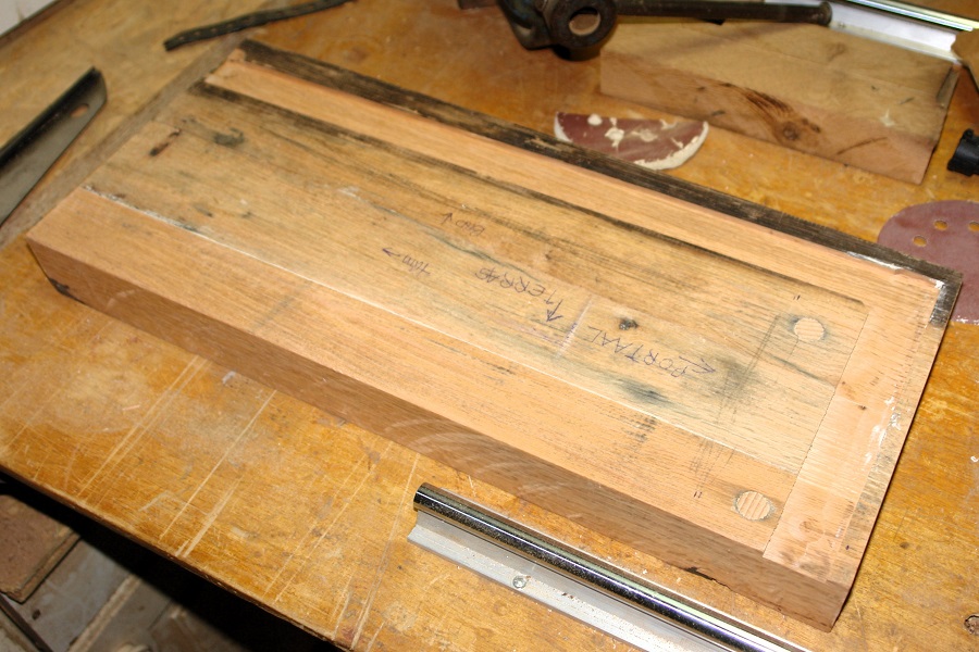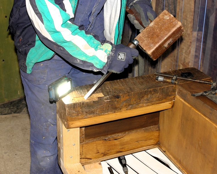 De omkasting van de stortbak wordt afgedicht met een stuk eiken wagonplank, die ook voor de vensterbank gebruikt is. In dit stuk zaten 2 gaten waarmee de planken vroeger op de wagen bevestigd werden. Omdat het in de omkasting geen insectenhotel met stromend water moet worden, hebben we de gaten iets uitgeboord en er van onderaf een stukje deuvel van 18 mm ingeslagen. Aan de bovenkant blijven de rustieke gaten in het zicht.