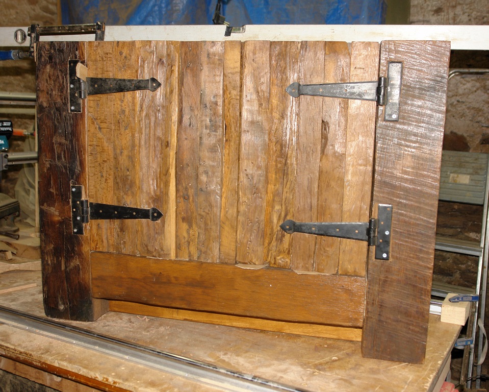Het werk aan het badkamer2wastafelmeubel staat al een tijdje stil en vandaag zijn we verder gegaan met het 2 e deurtje. Net als aan de zijkant zitten er leemwikkellatjes in het zicht en die moeten hier en daar wat vlakker en rechter worden gemaakt. Niet teveel, want het rustieke uiterlijk moet wel blijven.