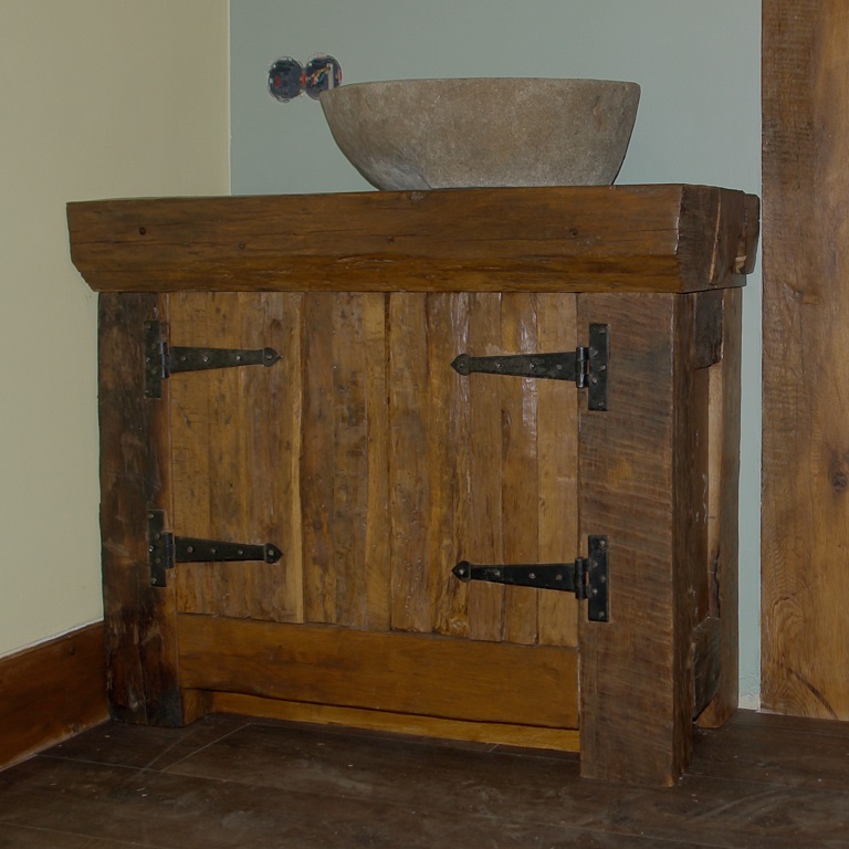 Tussen het werk aan het badkamermeubel door, is ook de stortbakdeksel op z’n plek gelegd. De laatste laag lak was droog en het staat prima. Het is van oude eiken wagonplanken gemaakt, met de originele gaten er nog is. Het ligt er los op, zodat we als het nodig is bij het binnenwerk kunnen.