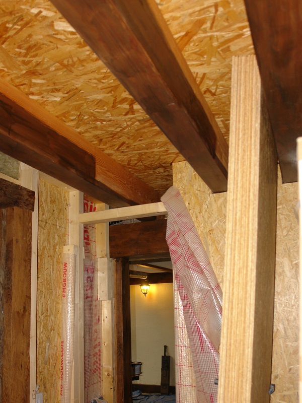 Nu het plafond van badkamer2 en dat van het terras zo goed als af zijn, komt het plafond van het portaaltje tussen de toekomstige woonkamer (=woonkamer2) en badkamer2 in beeld. Ook hier gaan we de balken van douglashout verdonkeren en komt er een geïsoleerd verlaagd plafond tussen de balken.