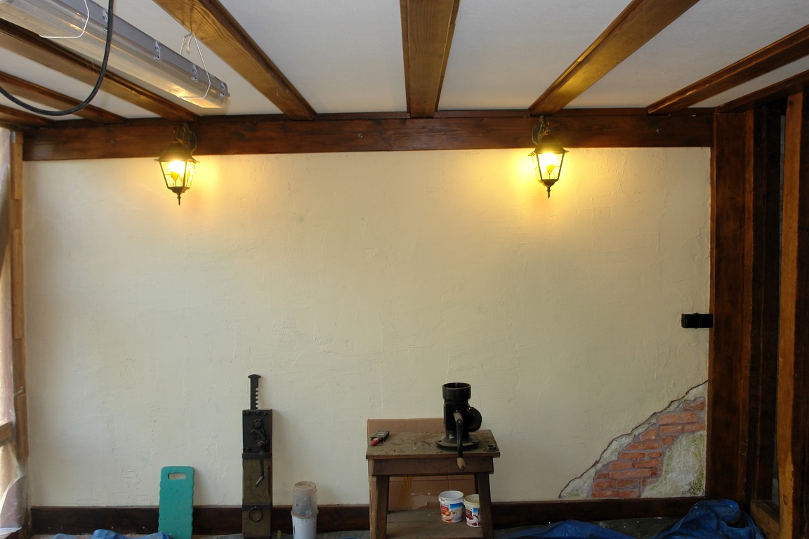 Wat ook af is, is de elektra van het terras; de 2 “old-look” lantaarns hangen aan de blinde muur, het bouwstopcontact is na jaren trouwe dienst vervangen door een definitieve. Wat nog niet definitief is, is de lamp boven de tafel (die er nog niet is). De bouw-TL die er nu nog hangt wordt t.z.t. vervangen door oude eikenbalklamp.