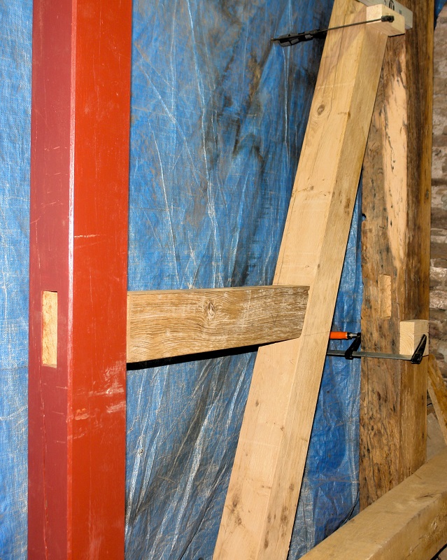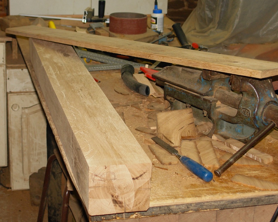Voor dit balkje konden we niet echt een passend stuk oud hout vinden, maar er lag nog een stuk nieuw eikenhout dat bijna de goede lengte had. Dit was wel 3,5 x 13,5 cm, terwijl we 12,5 x 11,5 cm nodig hadden. De 2 plakken eraf zagen ging goed en daarna waren de tappen aan de beurt.