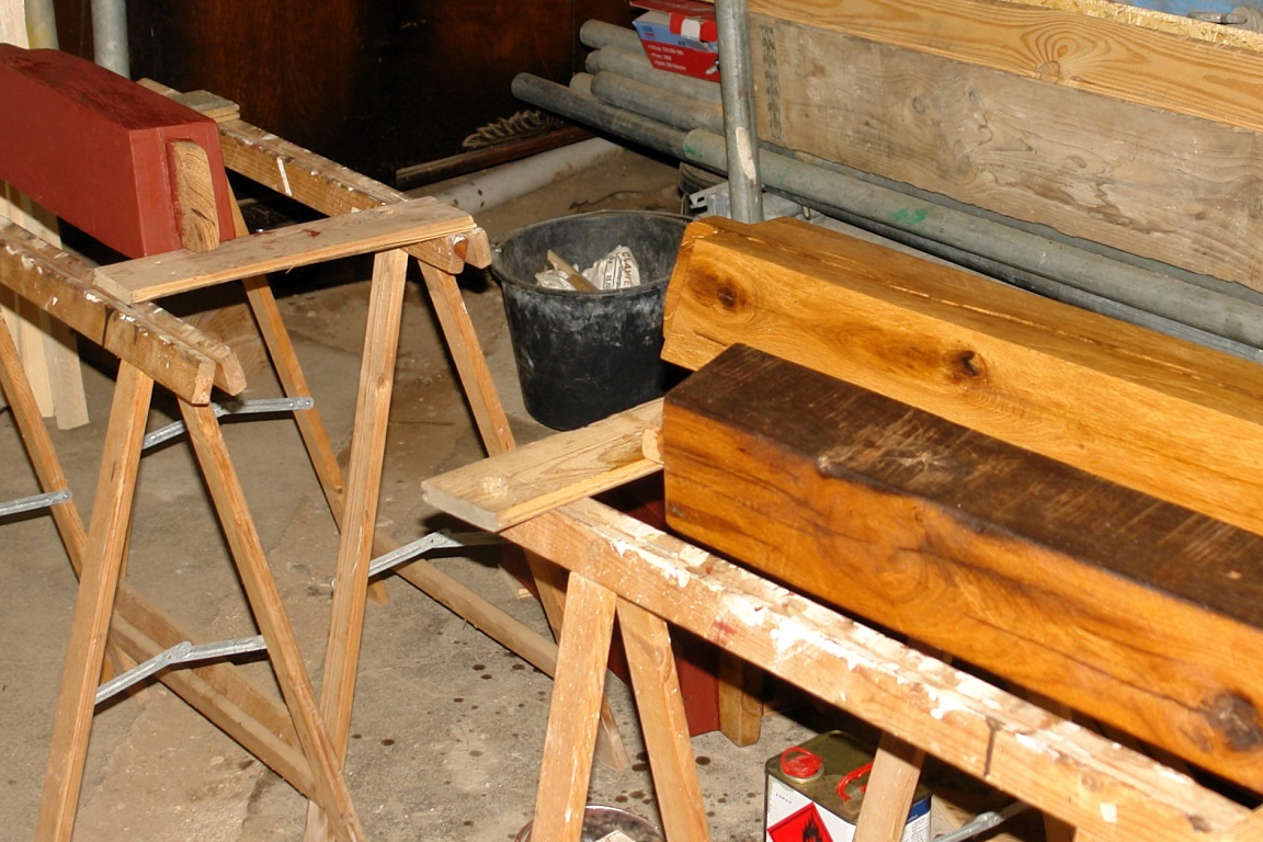 Er moet dus een ander balkje komen voor het achtergevelvakwerk. De ene was te dun, de ander te dik, te kort of te slecht. Kortom, we vonden geen geschikte balk en dus maken we maar een balkje uit 2 stukken van een oude staander. Die staander is te slecht om als geheel te gebruiken en het nadeel van oude staanders is, dat er doorlopende tapgaten in zitten. Na het nodige gezaag en geschaaf kon er precies genoeg bruikbaar hout uitgehaald worden. Omdat er wat houtwormsporen waren, wordt het eerst geïmpregneerd en gaan we er morgen mee verder.