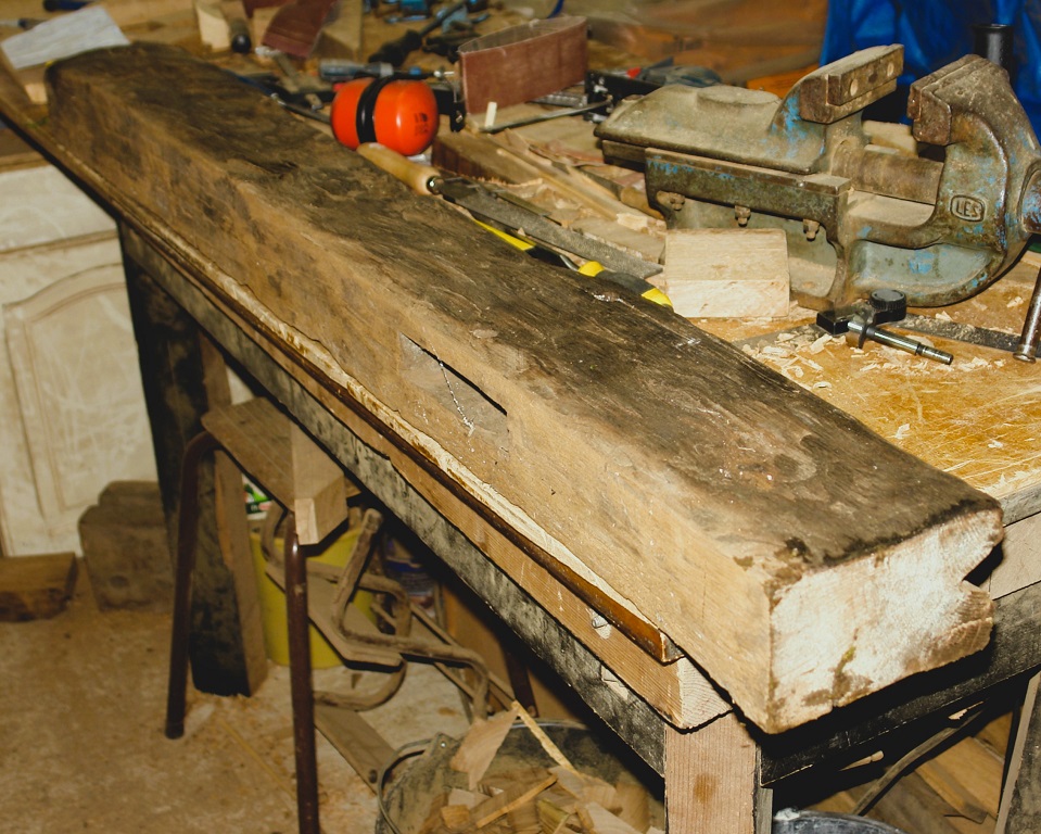 In de voorraad oude balken lag een geschikte balk en toen we bezig waren met het op dikte maken, kwam de gedachte naar boven, dat dit wel eens een goede balk voor het badkamermeubel zou kunnen zijn. Het bleek precies de goede lengte te hebben en de ‘old look’ komt hier volledig tot z’n recht, iets wat met een laag ossenbloedrode verf een heel stuk minder is.