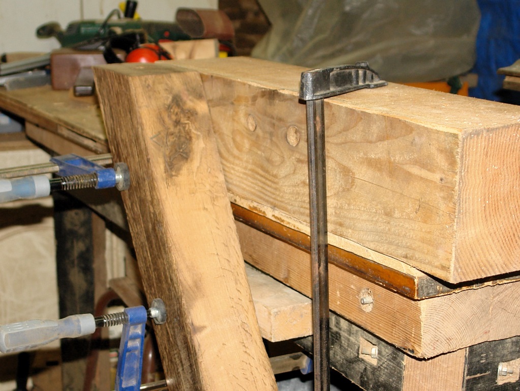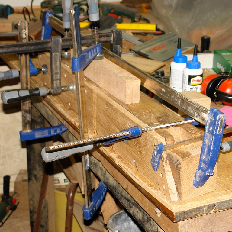 Het balkje heeft als het goed is niets te houden en als dat wel zo zou zijn, dan is dat heen probleem, want het kan wel wat hebben. Uiteindelijk is alleen de voorkant zichtbaar en als de donkerrode lijnolieverf erop zit, valt het niet op, dat het balkje uit 3 delen bestaat. Als de lijm droog is, wordt het verder afgewerkt, net als de nodige andere balkjes die vandaag weer een behandeling kregen.