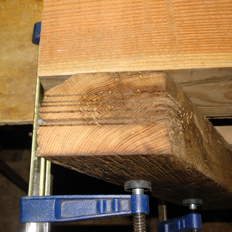 Bovenin het laatste balkje komt een losse tap en dat is lastiger in een schuine balk. Met een hulpbalk hebben we hem vast gezet en gleuven gezaagd. De “dammetjes” weggeslagen en vlak gemaakt met een beitel en je hebt een sleuf voor een losse tap.