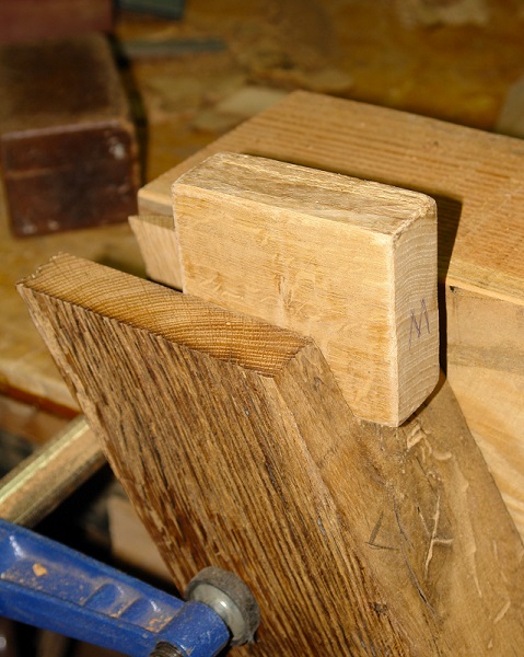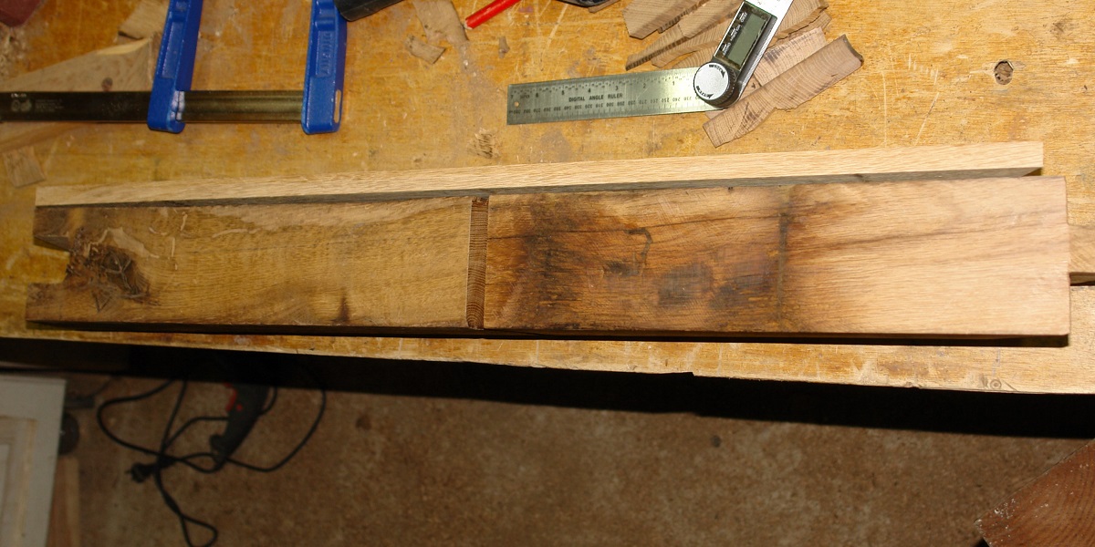 Dit balkje bestaat uit 3 delen; 2 stukjes eiken balk en een eiken plank om de zaak bij elkaar te houden. Samen heeft het de juiste lengte, hoogte en breedte. Nadat alles gezaagd was, hebben we het gelijmd, met voor de zekerheid wat schroeven (aan de achterkant).