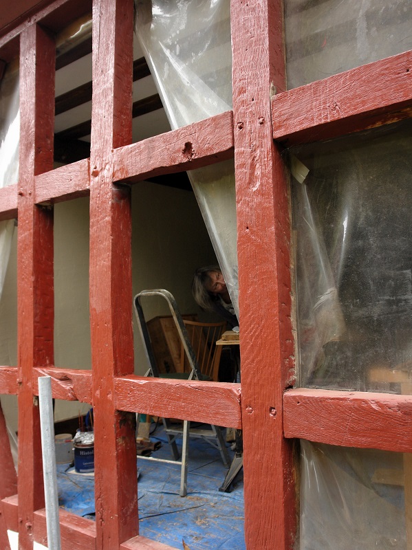 Net voor de regen begon, konden we de buitenkant van de 4 kruizen van het achtergevelvakwerk nog verven. De regen stond op de achtergevel en doordat het plastic er weer tegenaan moest, kon er binnen nog niet geverfd worden. Omdat het (ons) opvalt dat hier en daar de uiteinden van de vakwerkpennen ontbreken, overwegen we om die erin te zetten; de oude wegboren en dan een nieuwe erin.
