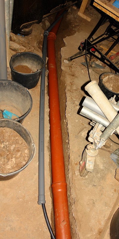 Vorig jaar hebben we de definitieve afvoer buitenom gelegd van de Scheune naar de garage en daar aangesloten op de tijdelijke afvoer (uit 2007!). De afvoer in de Scheune was zaterdag gemaakt en nu stond die in de garage op het programma.