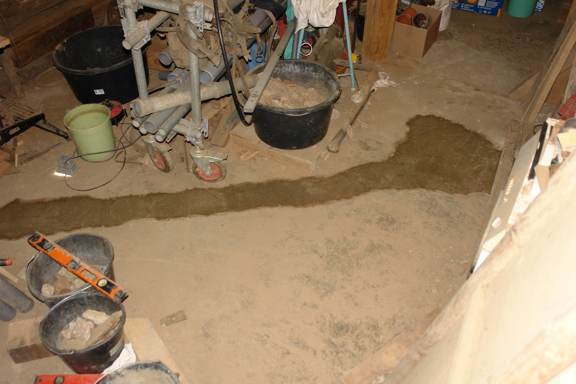 Het afschot van de afvoer in de garage was nog steeds goed en het dichtgooien kon beginnen. Rondom de afvoer en de mantelbuis van de waterleiding hebben we eerst zoveel mogelijk zand en droog leem gestort. Daar bovenop kwamen stenen en keien, die in het beton verdwenen. Omdat we geen aparte afwerkvloer maken, hebben we relatief fijn beton (tot 8 mm) gebruikt.