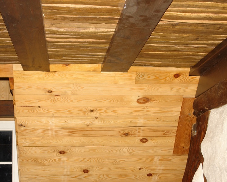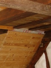 Een van de karweitjes in deze categorie is een stukje dakbeschot rechts van de dakkapel. De plankjes die hiervoor nodig zijn, hebben (dubbel) verstek en omdat een balk van de dakkapel wat uitsteekt, moet de dikte van de plankjes op sommige plaatsen gehalveerd worden. Ook moeten ze aansluiten op de onregelmatig gevormde leemwikkellatjes aan de onderkant van het tussenvloertje.
