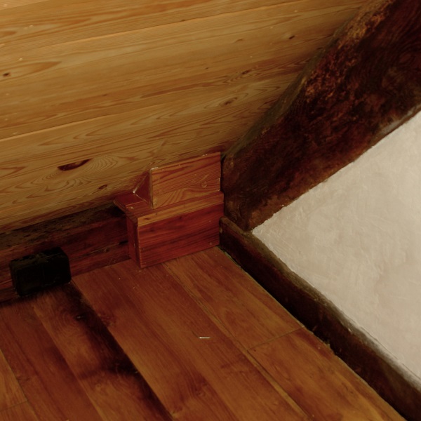 Het volgende karweitje was het wegwerken van een aantal elektriciteitskabels in een hoek van de puntkamer. Het grootste deel was al onzichtbaar weggewerkt, maar een klein stuk niet. Er zit nu een soort dubbele koof omheen; aan de onderkant van douglashout, wat t.z.t. donkerder gemaakt wordt, net als de balk erachter.