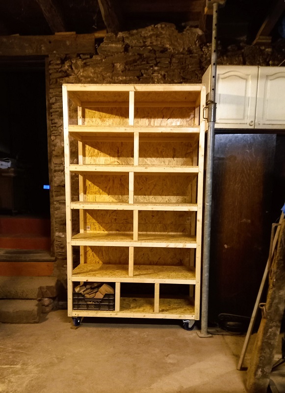 Het lukte om het rek af te maken, maar het overeind zetten viel nog niet mee. Een globale berekening gaf aan, dat het rek – afhankelijk van de vochtgehalte van het vurenhout – minstens 110 kilo weegt. Het verrijden ging vanzelf, door de aflopende betonvloer in de garage en nadat het rek op z’n plaats stond, was er een Keil nodig om een zwevend voorwiel te voorkomen.