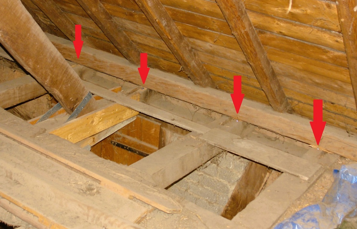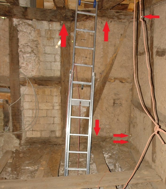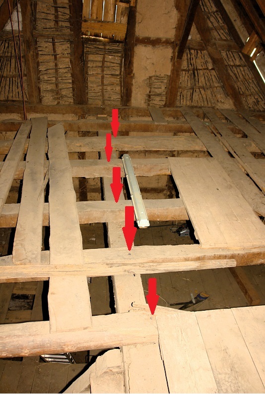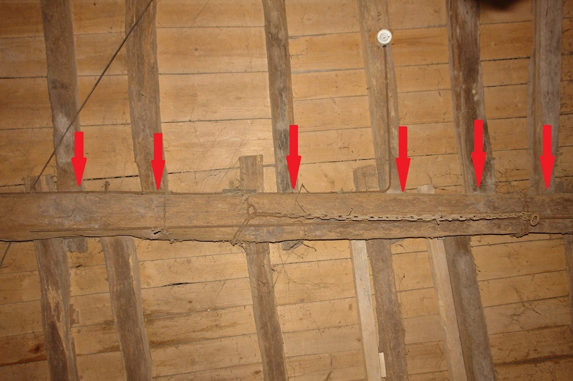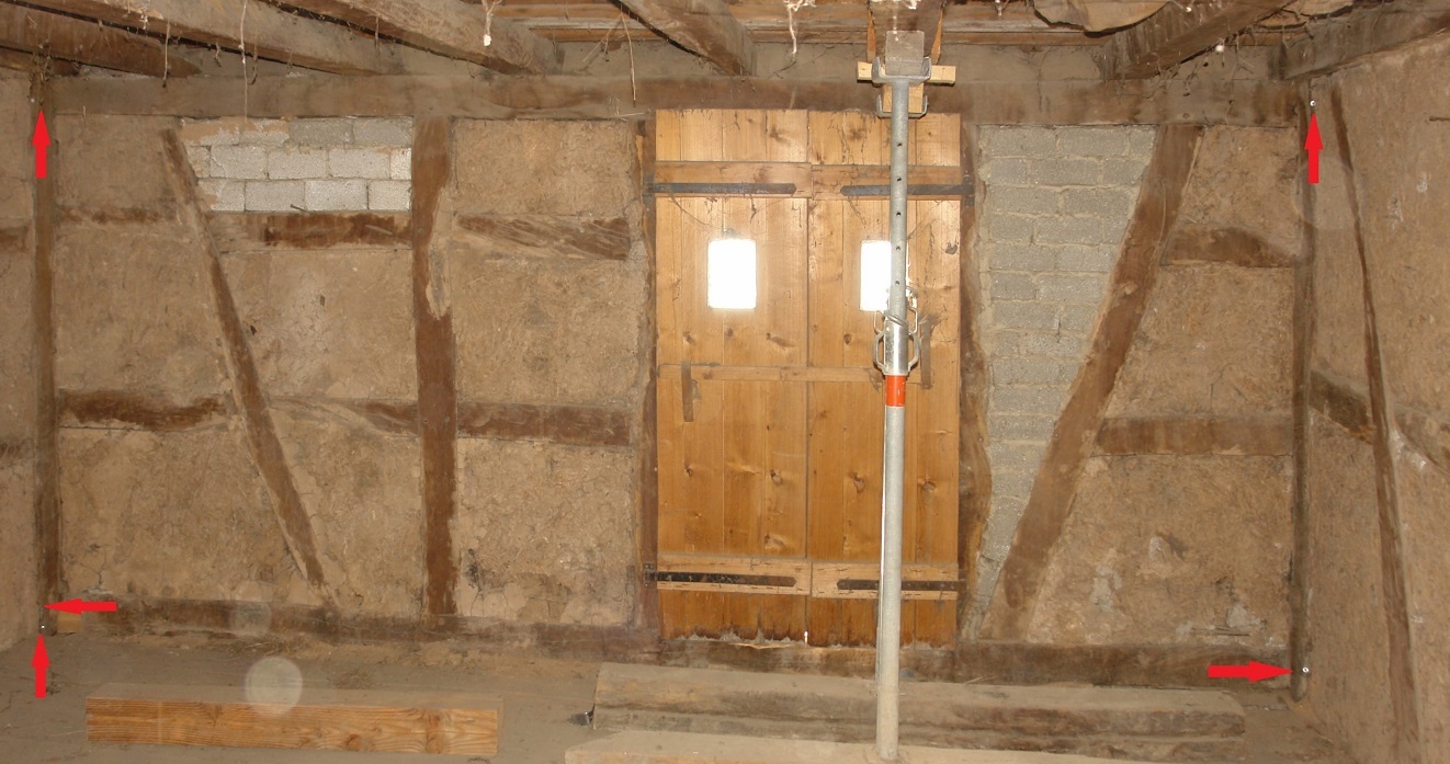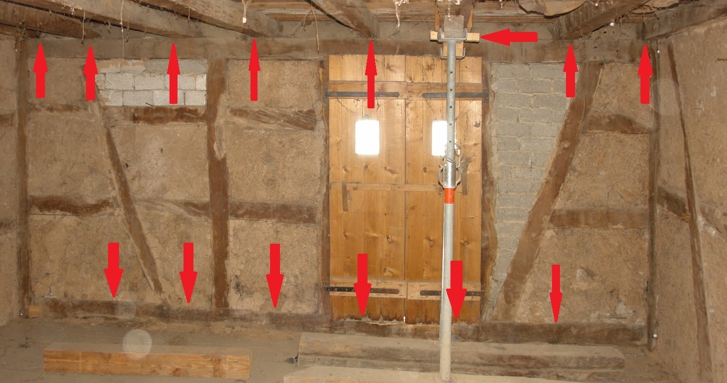 Daar waar de balken op de muur liggen komt het ringanker en het kan zijn, dat het steen onder de balken er helemaal uitvalt. Om de balken en het vakwerk omhoog te houden, komt er onder elke balk een schroefstempel op ca. 50 cm van de muur. Als de druk echter groot genoeg is, zou de balk als een soort wip kunnen kantelen. Er zit namelijk geen pen-gatverbinding in verticale richting, alleen in horizontale richting. Met deze schroeven wordt het kantelen van de balken dus voorkomen.
