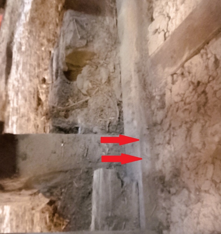 Met de volgende serie schroeven werd de onderbalk van het vakwerk aan de straatkant vastgezet op de vloerbalken. Hier zitten pen-gatverbindingen, maar de kwaliteit daarvan is onbekend. De schroeven zitten wat schuin, omdat we anders de vakken zo leeg hadden moeten halen, dat er waarschijnlijk het een en ander op straat zou vallen.