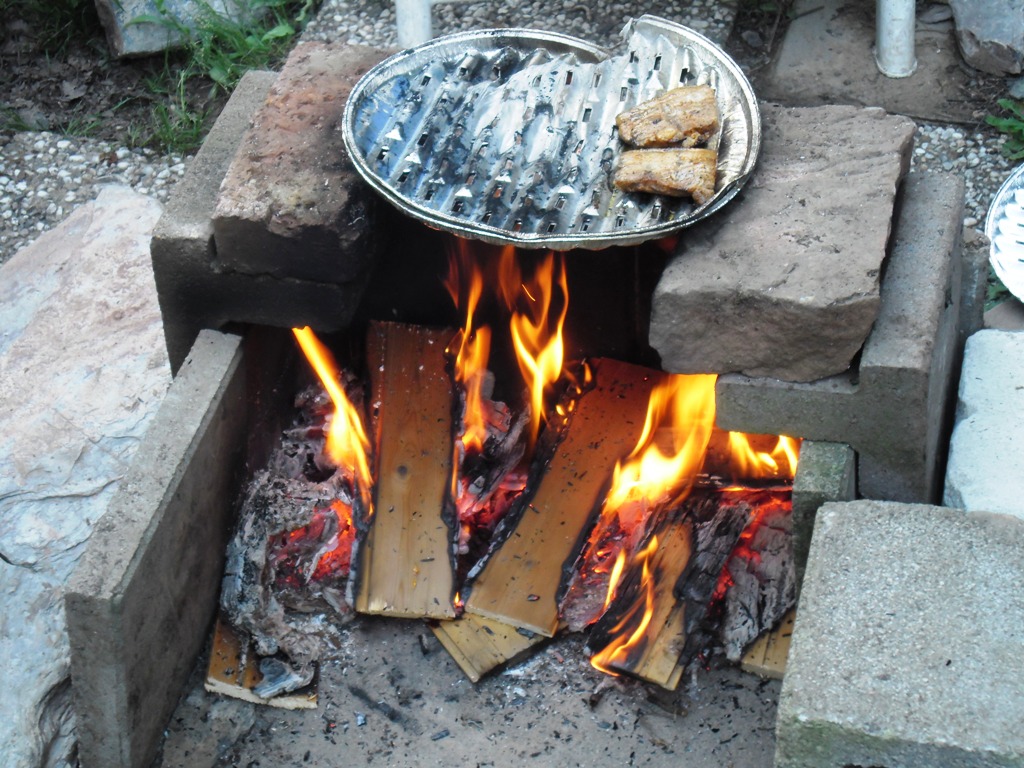 Aangekomen hing er een vleesrooklucht; we dachten dat het rookluik op de gang boven open was (geweest), maar het waren Junior & Co. die in de achtertuin een barbecue gemaakt hadden van de volop aanwezige stenen. Ook stookhout was in ruime mate aanwezig en 8 augustus 2013 gaat dus de geschiedenis in als de dag waarop er voor het eerst gebarbecued is!