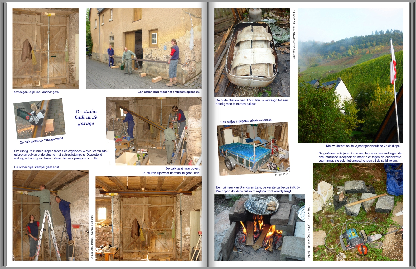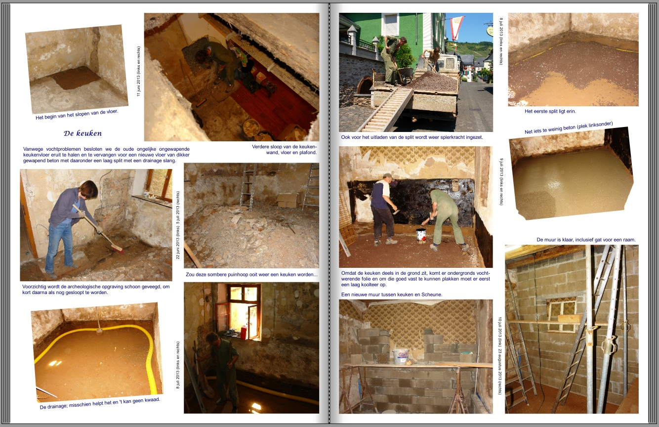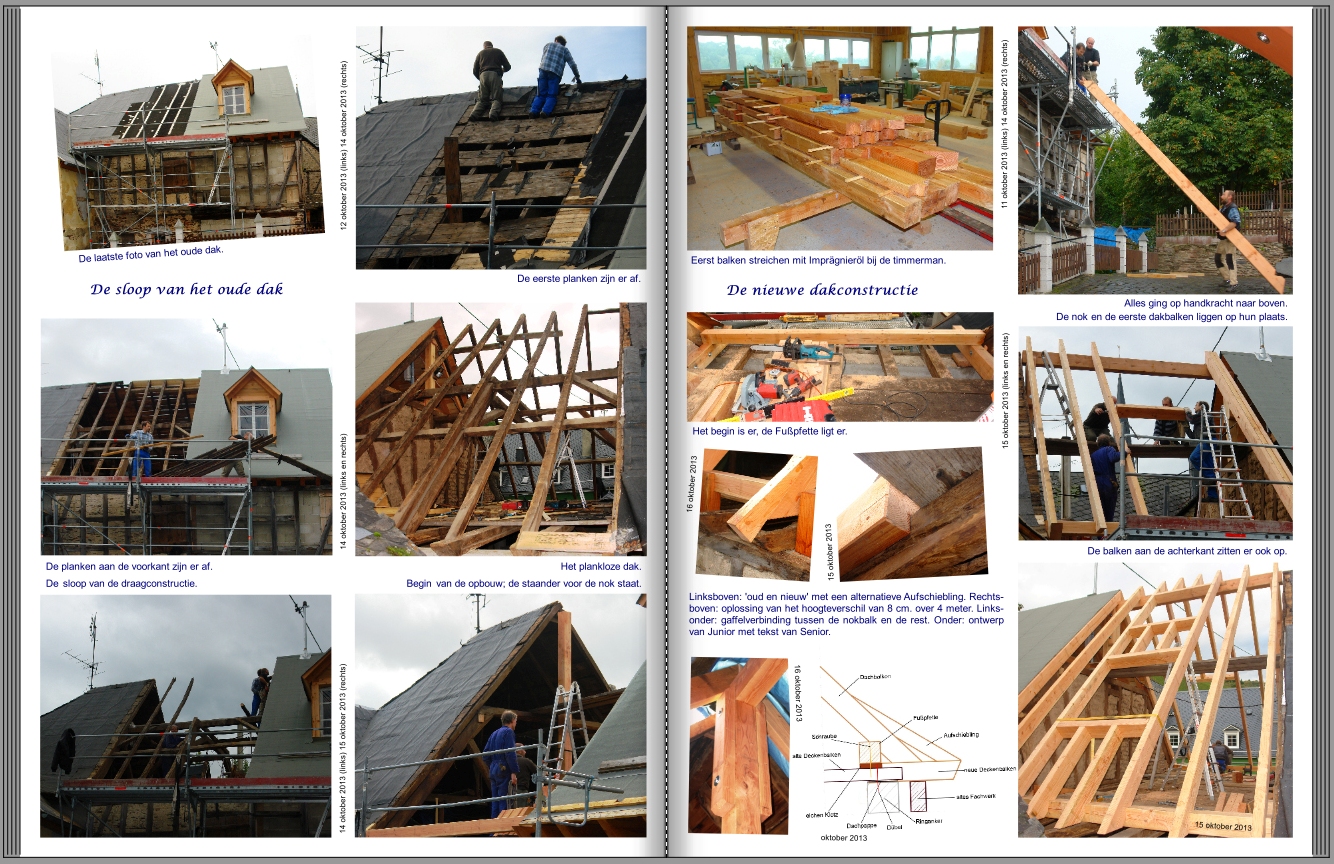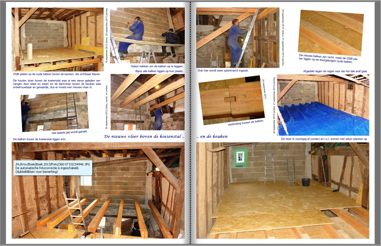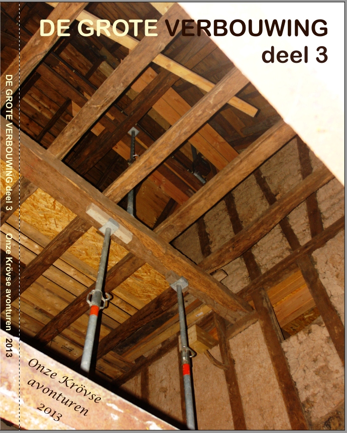 Zoals de titel eigenlijk al aangeeft gaat het boek met name over de grote verbouwing; in 2013 is, als vervolg op 2012, het volgende stuk aangepakt. De oude vloeren van de keuken en koeienstal hebben we eruit gesloopt en er zitten nu nieuwe vloeren in. Daarop staat een nieuwe oude vakwerkwand en daarop ligt weer een nieuwe tussenvloer. Boven de keuken is een wand vervangen en daarop rust het nieuwe dak. Voordat we hier aan konden beginnen moesten we nog wel de Dachständer van de elektriciteit laten verplaatsen.