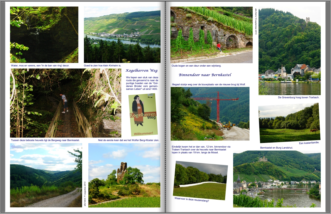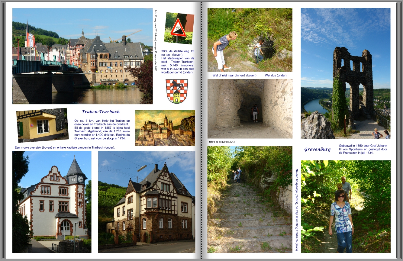 Kröv zelf komt natuurlijk ook aan de orde, met het Trachtentreffen en een paar wandelingen in buurt. Ook hebben we in 2013 weer een aantal plaatsen -soms opnieuw- bezocht en zodoende staan Hetzhof, Beilstein, Reil, Kinheim, Rißbach, Traben-Trarbach en Bernkastel erin. Ook de bouwwerken ontbreken dit keer niet; we zijn naar Burg Metternich en de Grevenburg geweest.