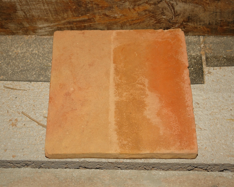 De tegels zijn enigszins poreus omdat ze niet geglazuurd en om het indringen van vuil te voorkomen gaan we ze impregneren. Om het effect hiervan te bekijken hebben we de helft van de tegel volgens de voorschriften 2x geïmpregneerd.