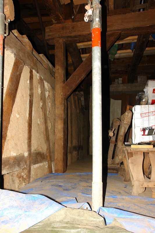 De trapbomen van de oude trap bestaan uit dikke balken, met daarin groeven voor de treden. Omdat de trap boven de garage wat verzakt is, zitten er extra steuntjes onder. In onze oudhoutcollectie hebben we één balk gevonden die precies goed is en nog een tweede die een centimeter of 50-60 verlengd moet worden.