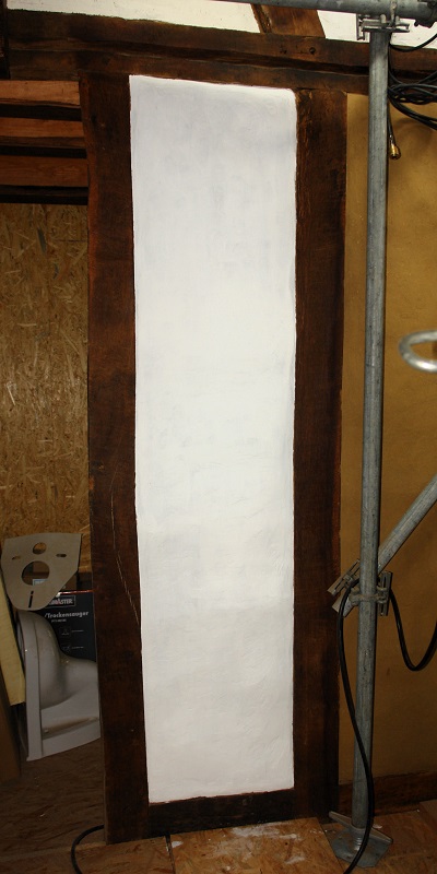 7 augustus 2021 – bij de vakwerkwand van woonkamer2 gingen we verder met de Oberputz. Deze fijnere leemstuc moet de scheuren in de grovere Unterputz dichten en het een mooier aanzien geven. Als laatste kan er dan een laag Feinputz op, die -zoals de naam al aangeeft – nog fijner is en ook de haarscheurtjes moet dichten. Daarna is het klaar om te verven of de fixeren.