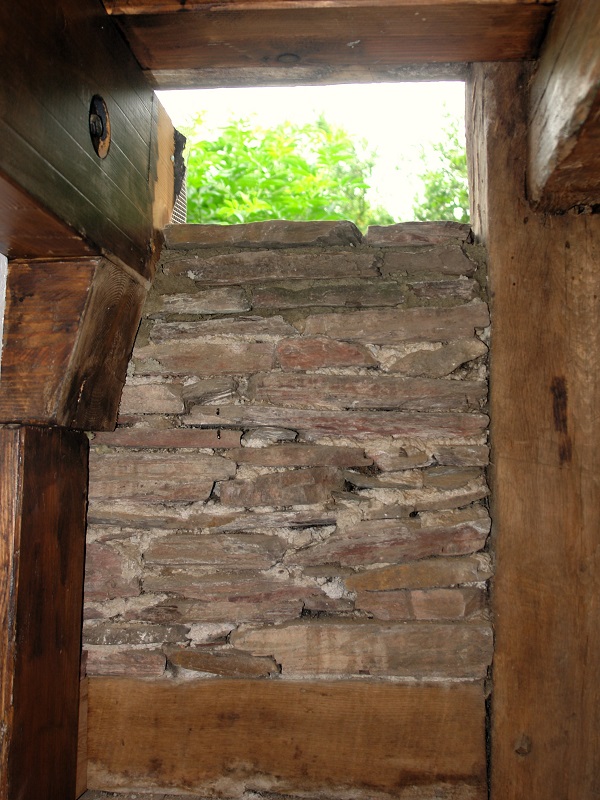 Deze soort van driehoek moet dichtgemaakt worden en dat doen we in stijl van de achtergevel; stukjes eikenhout (met dezelfde schuinte als het vakwerk) op de plaats waar de regels van het vakwerk zitten, met ertussen gestapelde stukjes leisteen. Deze (geïmpregneerde) blokjes hout zitten erin en ook een stuk Douglas hout met dezelfde vorm als de voet die onder de staander zit. Als ze donkerder gemaakt zijn vallen ze niet of nauwelijks meer op (denken we).