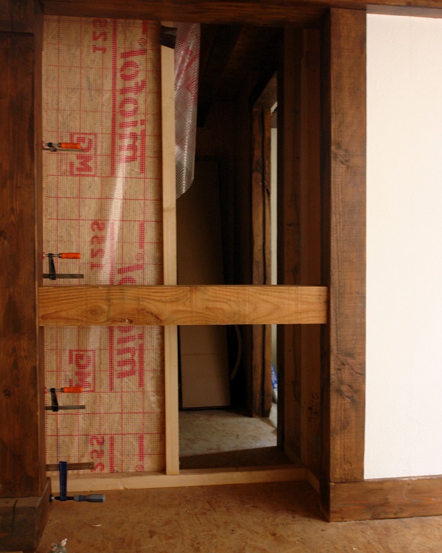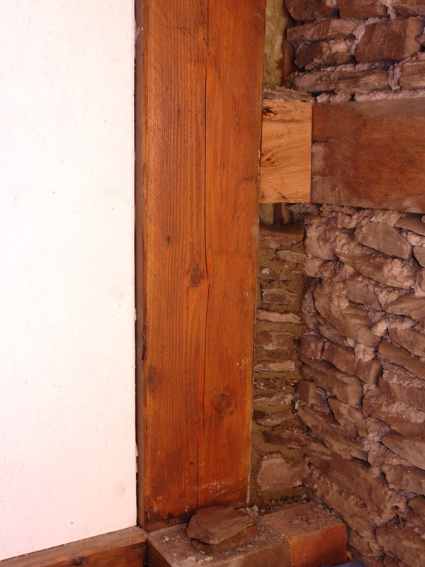Overal zitten er openingen tussen oude en nieuwe balken en wanden. Allemaal worden ze ooit dichtgemaakt en op die in het voorportaaltje zitten de eerste 2 (van de 3) afdichtlatjes. Tussen de staander en de leemvulling van het vakwerk zit ook een opening van een centimeter of 10 en om dit af te kunnen dichten hebben we een dikke plank op de staander gelijmd.
