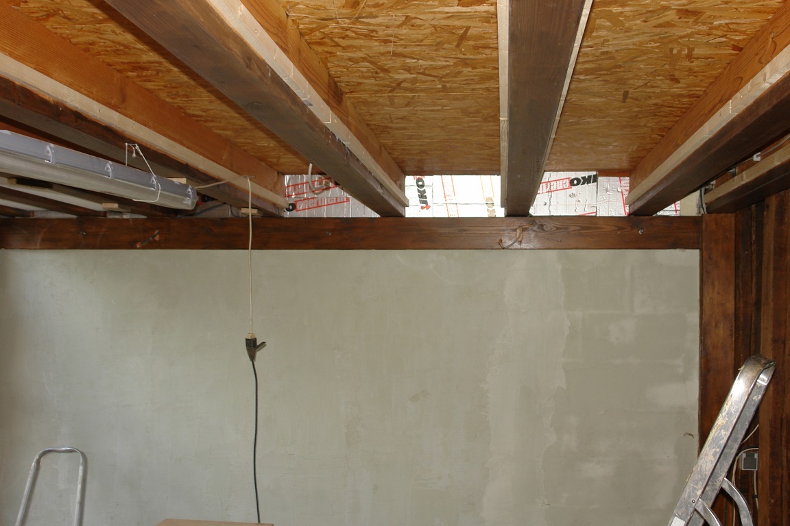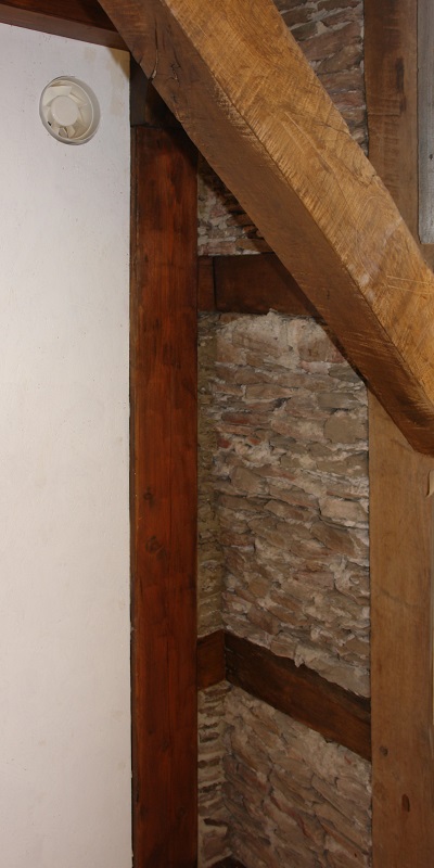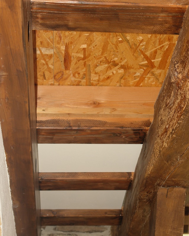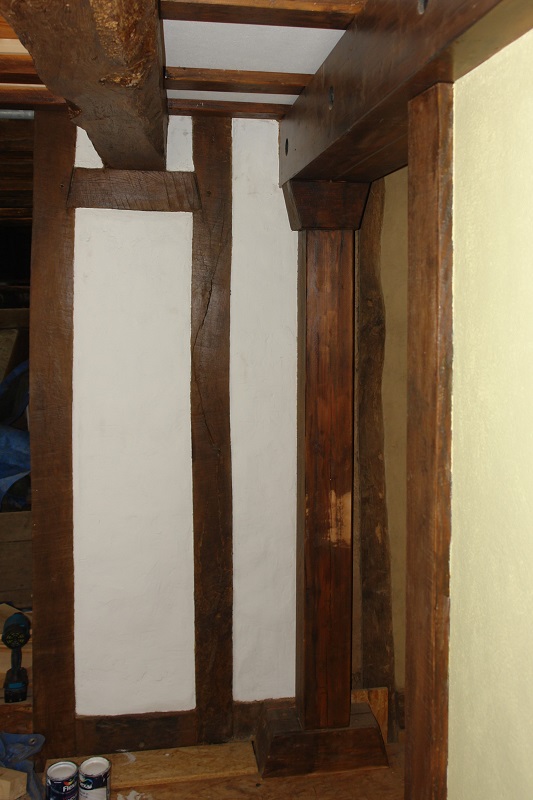Omdat de huidige (=nieuwe) balkenlaag op het terras wat hoger ligt dan de oorspronkelijke, moet er een rij regels in het vakwerk van de achtergevel komen. De vraag hierbij is: “Oud hout of nieuw hout?”