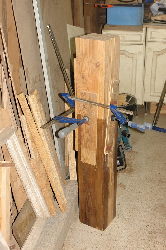Om de juiste lengte te krijgen, hebben we het ontbrekende stuk van een andere plank/balk afgezaagd. Ook hier moesten we de schaafafdruk wegschuren en de hoogte op maat zagen. Op het geheel zitten nu de nodige lijmklemmen en morgen zien we of de lijmpoging geslaagd is.