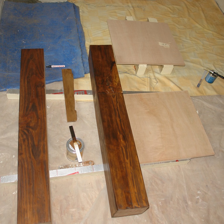 Nu duidelijk is waar de OSB-platen precies zitten, kan waar dat nodig is, het douglashout donkerder gemaakt worden. We waren hier al eerder mee bezig geweest, maar wisten toen nog niet precies waar de OSB-platen en ander hout zouden komen.