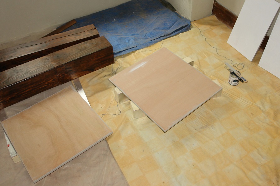 De plafondplaat voor het terras kwam dit keer niet goed uit de lijmklemmen. Er was blijkbaar te veel lijm op de hulpbalkjes gekomen, want toen we die eraf wilde halen, kwam er wat de plaat mee. Die beschadigingen moeten nu bijgewerkt worden. Het zagen en frezen van de stukken voor de volgende plafondplaat ging gelukkig wel goed, Die zijn nu af.