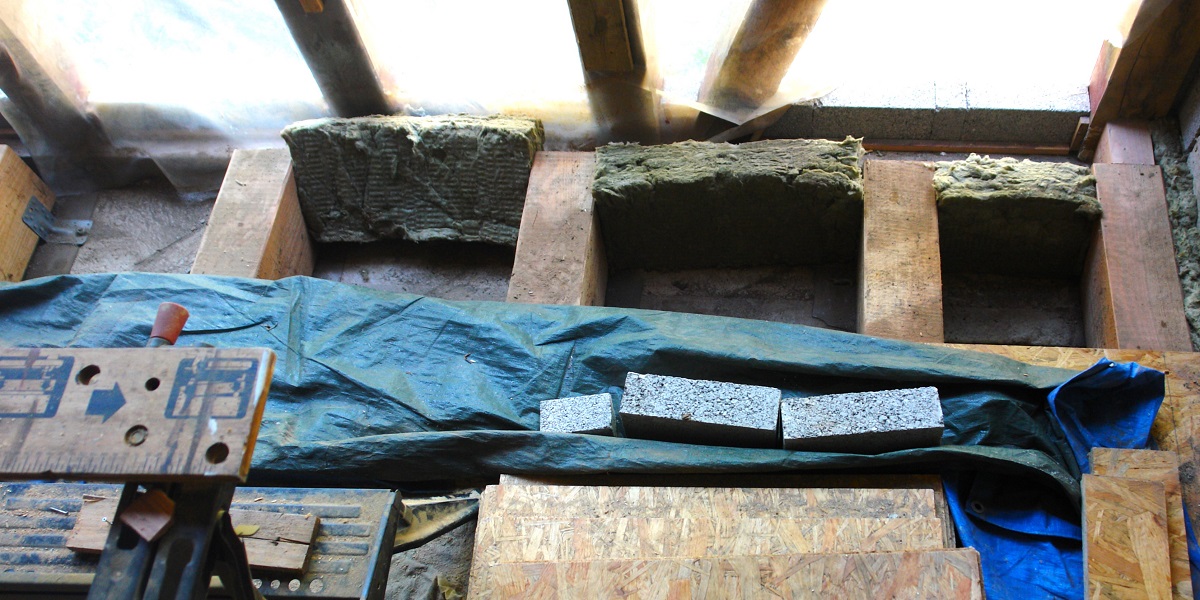 20 augustus 2025 – de plafondplaat op het terras ligt steeds vaker in de weg en het werd hoog tijd om die op z’n plaats te zetten. Voor het zover was, moest er eerst 2x 8 cm steenwol in, niet zo zeer als plafondisolatie voor het terras, maar meer als vloerisolatie voor de ruimte erboven.