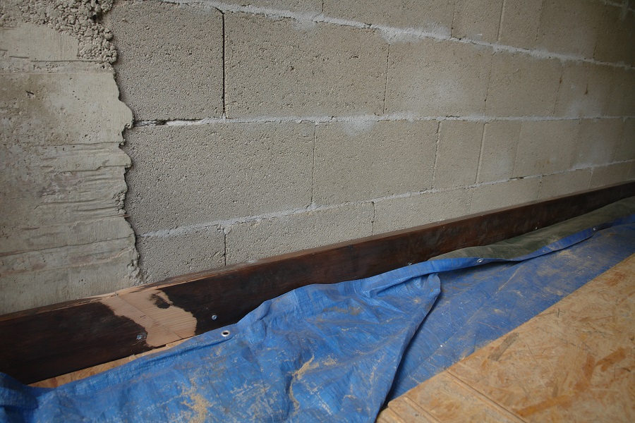 Een balk die regelmatig in de weg ligt, is de plintbalk van de toekomstige pantry op het terras. Om weer eens te zien hoe het staat, ligt de balk nu los op z’n plaats. Het vastzetten komt nog en we gaan ook nog kijken of er genoeg teenruimte is als je ervoor staat.