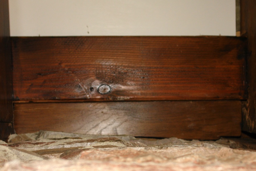 11 augustus 2023 – de afdichtplank tussen staander en leemwand paste goed; nu de voet nog. Van afvalstukken douglashout hebben we een voet gemaakt en als die morgen droog is, kan die erin en is deze opening dicht.