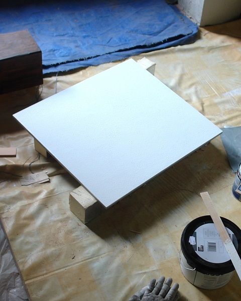 Er ligt een verse plafondplaat op de behandeltafel. Als eerste werden de beschadigingen van het lijmen hersteld en nu zit er grondverf op.
