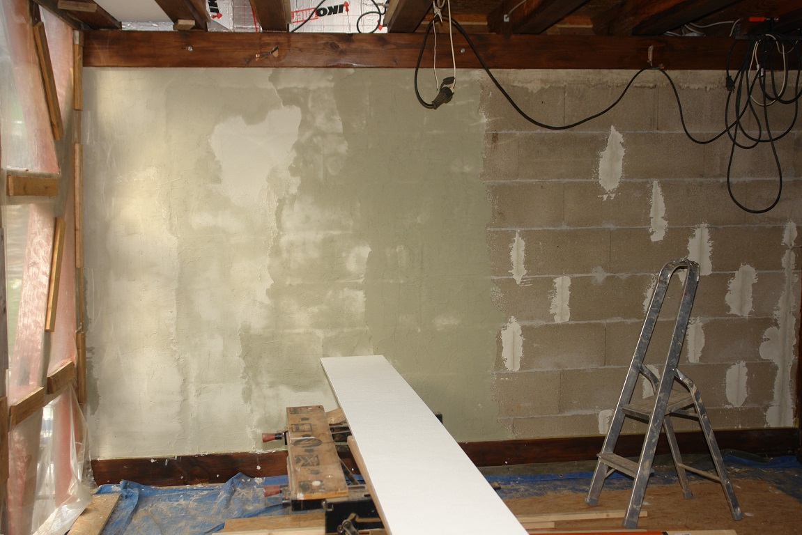 Die laag hebben we zo vlak mogelijk gemaakt, zodat we de Oberputz (die op is) kunnen overslaan en er meteen Feinputz op kunnen doen.
