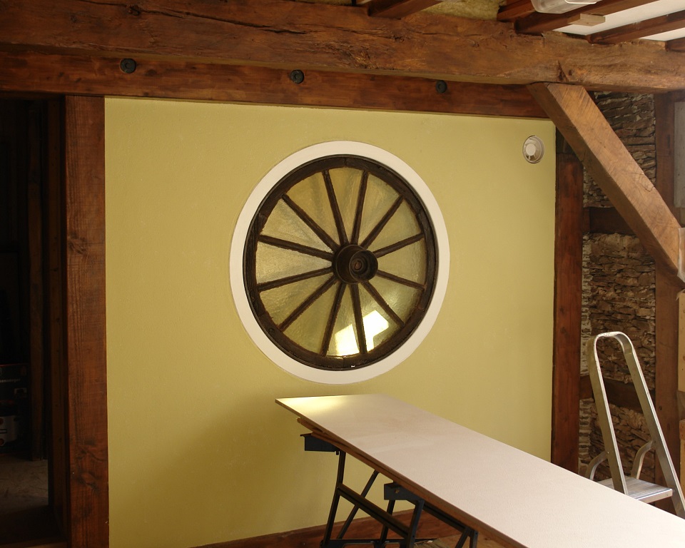 Een memorabel karwei was het plaatsen van het wagenwielraamkozijn in de wand tussen badkamer2 en het terras, gevolgd door het wagenwielraam; een origineel oud loodzwaar houten wagenwiel, met een diameter van ruim 1 meter, waarvan de ruimte tussen de spaken is gevuld met geelachtig gekleurd glas. Het lelijke gat in de wand is hiermee voorgoed verleden tijd!
