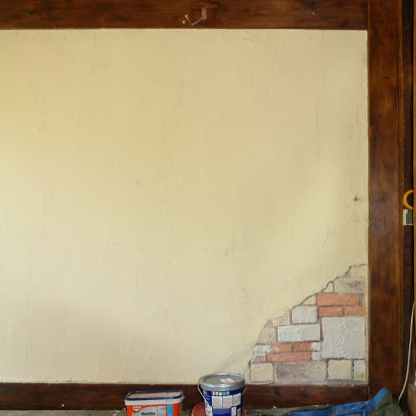 12 oktober 2021 – de vakwerkvulling van de wand tussen woonkamer2 en de terraskamer is ook hard aan een opknapbeurt toe. We hebben de grootste gaten gedicht met een grove leemvulling van leemsteenresten en -gruis en als dat droog is (wat in deze tijd van het jaar wel even kan duren) kan de Unterputz erop.