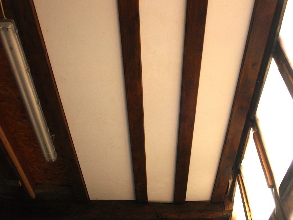 De plafondplaat het dichts bij de kamer, is half zo breed als de platen ernaast en daarom gebruiken we hiervoor platen van 12 mm i.p.v. 15 mm. Toen we dit besloten hadden, zaten de bevestigingslatjes er al op en die zaten dus 3 mm te hoog. Verzetten is geen optie en dus zit er nu op de latjes een stripje hout van 3 mm, waardoor de plaat aan de onderkant even hoog hangt als de rest.