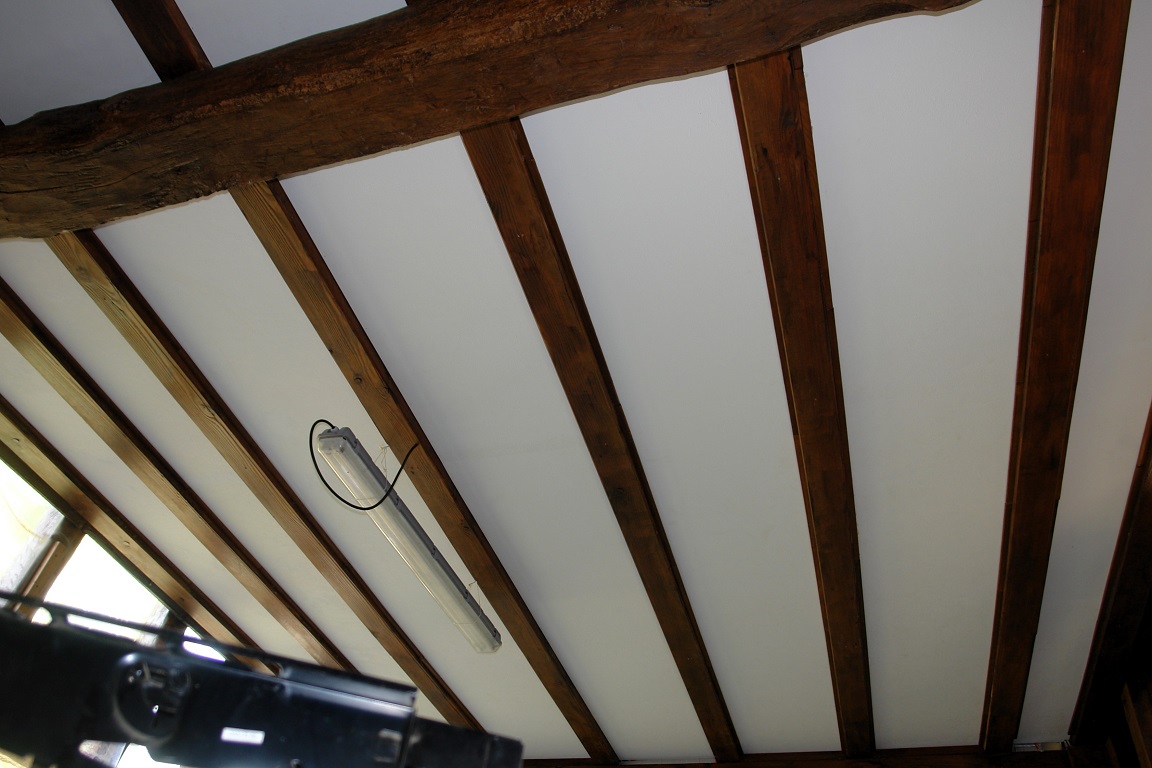 9 augustus 2025 – bij gebrek aan epoxy ligt het werk aan het vakwerk van de achtergevel tijdelijk stil en daarom hebben we het vakwerk weer dichtgemaakt. Het voordeel hiervan was wel, dat we nu verder konden met het verven van de plafondplaat, die al klaar lag op de bokken. Als die droog is, dan kan die erop.