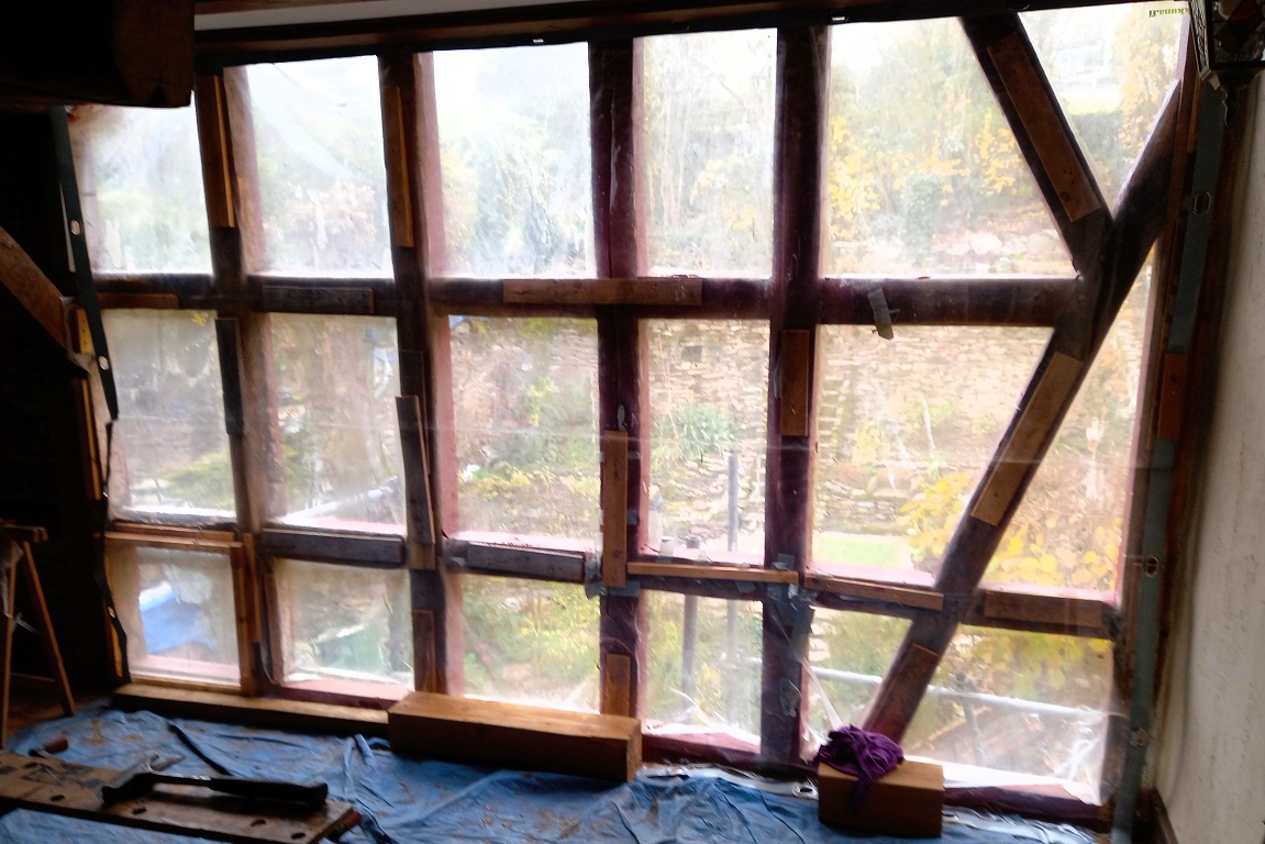 De toekomstige winterafdichting van het terras is wel besteld, maar nog niet binnen. De oude huidige afdichting is in diverse stukken gesneden, om aan de knooppunten van het vakwerk te kunnen werken. Door de harde wind, die af en toe recht op de achtergevel staat, flapperen de losse stukken naar binnen en geven wind en regen vrij spel. De oude latjes om het plastic vast te zetten waren – met een vooruitziende blik – nog niet opgeruimd en zitten er nu weer op.