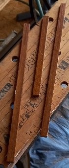 9 juli 2025 – na de gister gemaakte proeflatjes, hebben we er vandaag wat meer gemaakt en de eerste zitten in de vochtwerende beits. Je zou het niet zeggen, maar op de foto zie je ruim 20 meter aan afwerkrandjes. Bij een globale berekening kwamen we uit op ruim strekkende 55 meter. Het duurt wel even voordat ze allemaal gemaakt en gebeitst zijn en erop zitten.